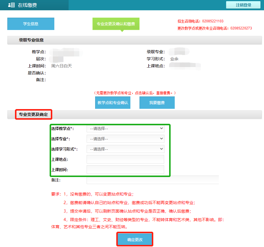 点击“确定更改”后,在“录取专业信息”处完成教学点和专业确认及缴费操作,参考附件2操作。